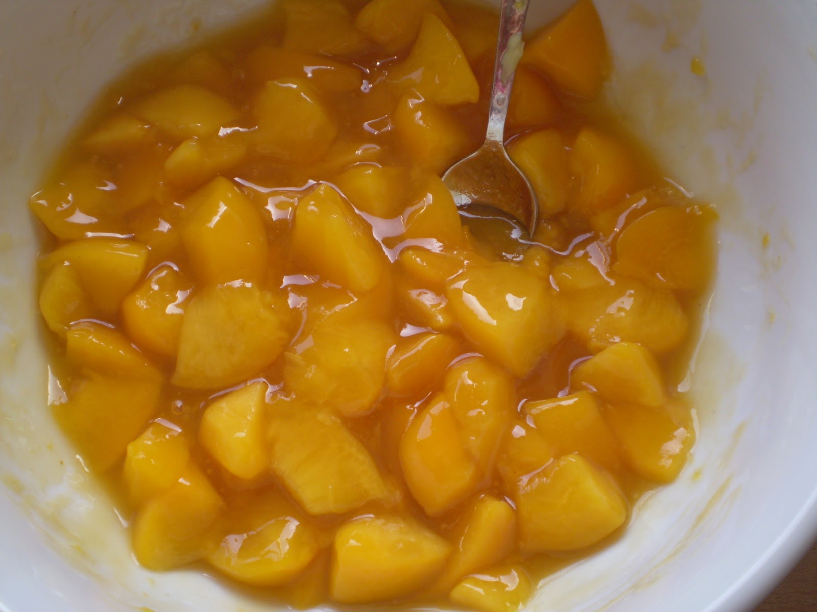 Dejar que suba la masa aproximadamente una media hora. Mientras preparar los rellenos. En un bol echar mermelada de melocotón con los melocotones en almibar previamente escurridos y picados.